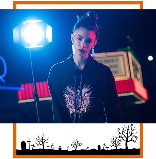 JECCI FIVE杰西伍女装2018年万圣节穿搭推荐,凌厉的双眼在黑暗当中早已洞悉一切,美到发紫的装扮,时刻激发你搞怪的鬼点子,时髦精早已玩腻了装神弄鬼,抓准吓人的小把戏,出其不意才能让人尖叫一整晚,“完胜”全场!